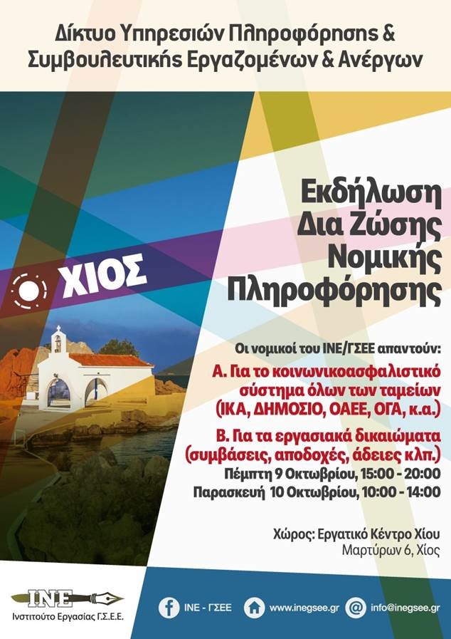 Θα θέλαμε να σας ενημερώσουμε ότι την Πέμπτη 09/10 ώρες 15:00-20:00 και Παρασκευή 10/10 και ώρες 10:00-14:00 στον χώρο του Εργατικού Κέντρου, θα βρίσκονται οι Νομικοί Συνεργάτες του ΙΝΕ/ΓΣΣΕ και θα απαντούν σε ερωτήματα εργαζομένων (εργασιακά, ασφαλιστικά) όλων των ταμείων (πχ πότε μπορώ να συνταξιοδοτηθώ).