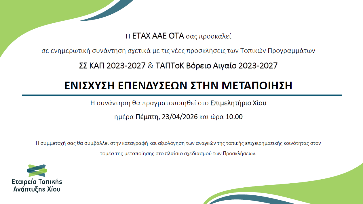 Ενημερωτική εκδήλωση για Ενισχύσεις Επενδύσεων στην Μεταποίηση | ΣΣ ΚΑΠ 23-27 & ΤΑΠΤοΚ 23-27 | ΕΤΑΧ ΑΑΕ ΟΤΑ