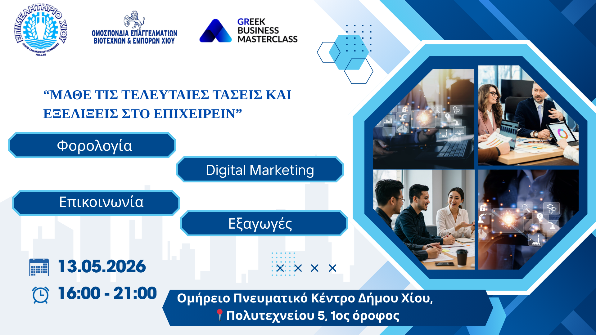 Το Επιμελητήριο Χίου σε συνεργασία με την ΟΕΒΕ Χίου και το Greek Business Masterclass, διοργανώνουν