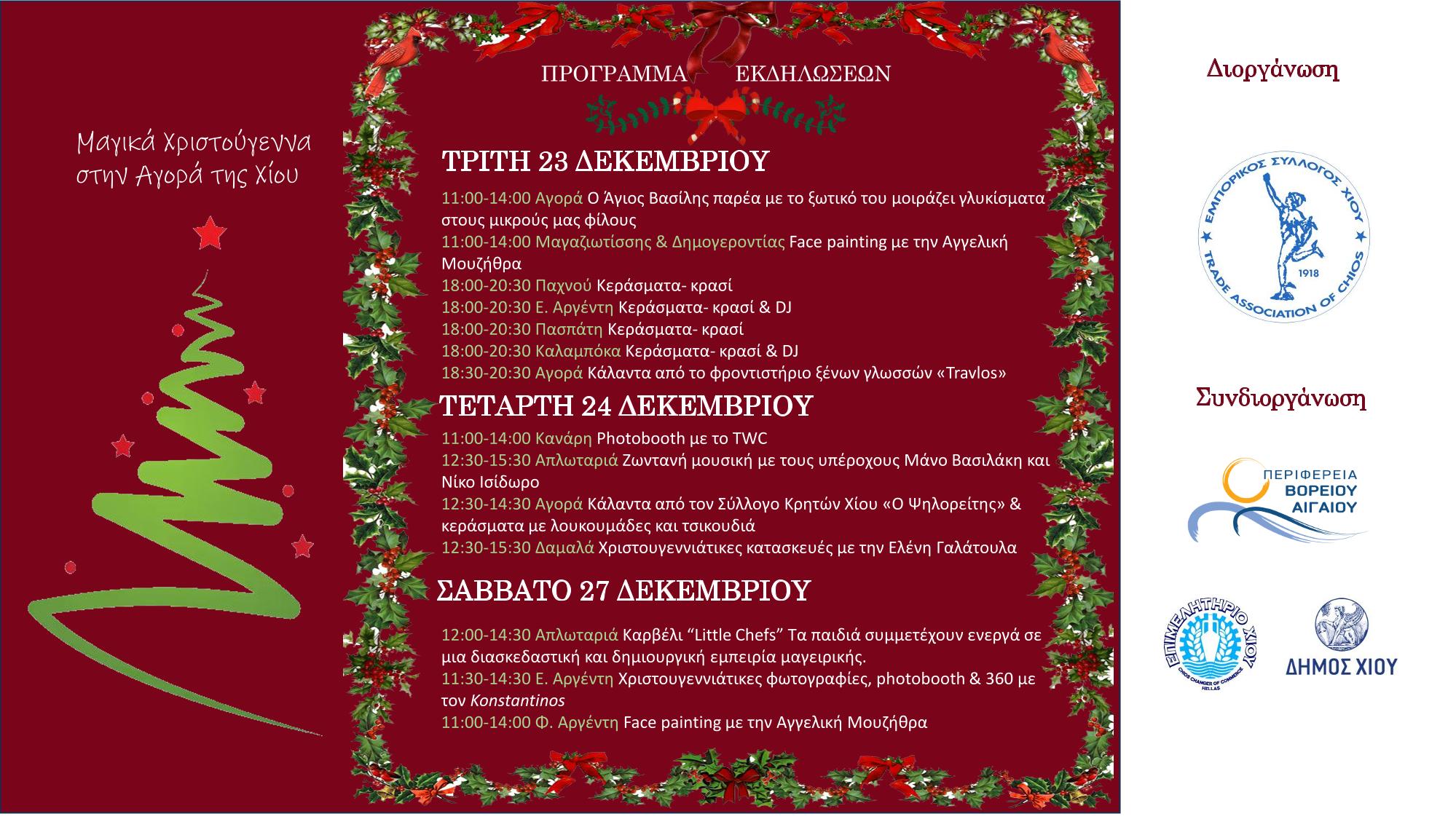 Ακολουθεί το Πρόγραμμα των Χριστουγεννιάτικων Εκδηλώσεων που θα πραγματοποιηθούν στην Αγορά της Χίου απο 16/12